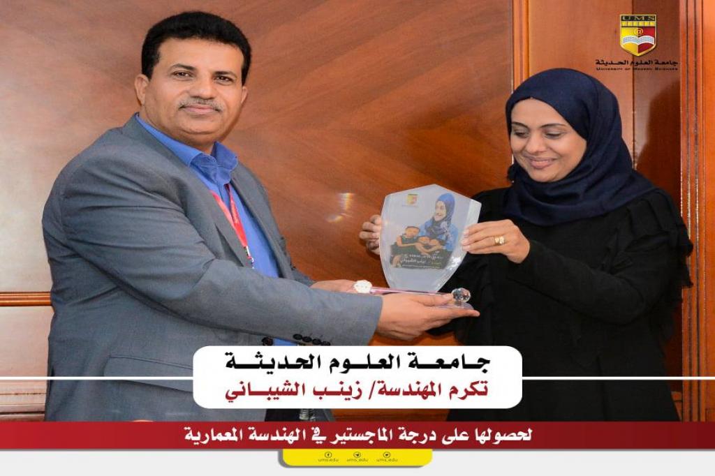 امين عام الجامعة يكرم المهندسة زينب الشيباني لحصولها على درجة الماجستير